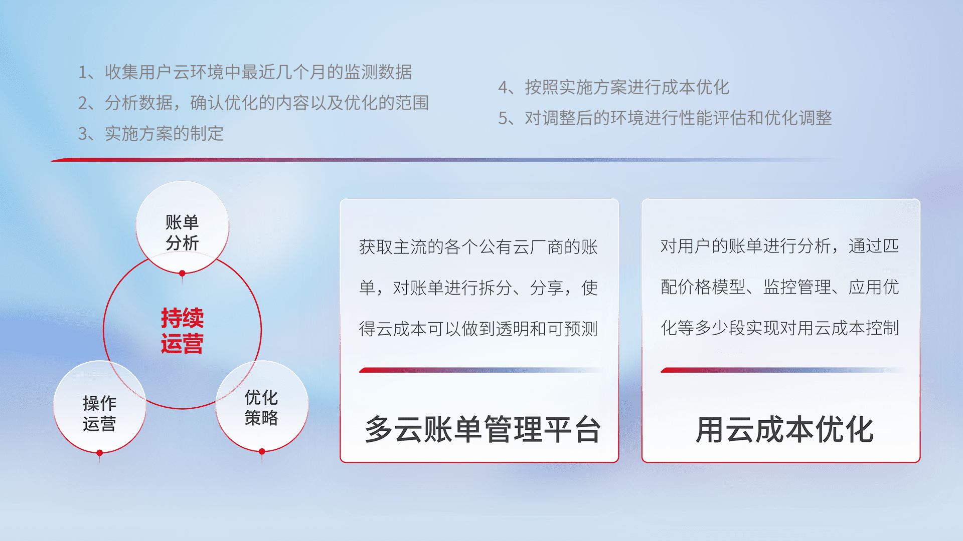 通过多云纳管,,,,以统一的资源数据模型把客户的云资源进行抽象和封装,,,,进而实现对多云资源的统一操作,,保障云资源管理的可靠性、、稳定性与可用性。。量身定制化运维内容,,,配置、、开发运维、、补丁管理、、备份、、监控、、认证和访问管理、、、、审计和日常巡检等,,保障在用云过程中的可靠度,,稳定度以及高可用率。。。。
